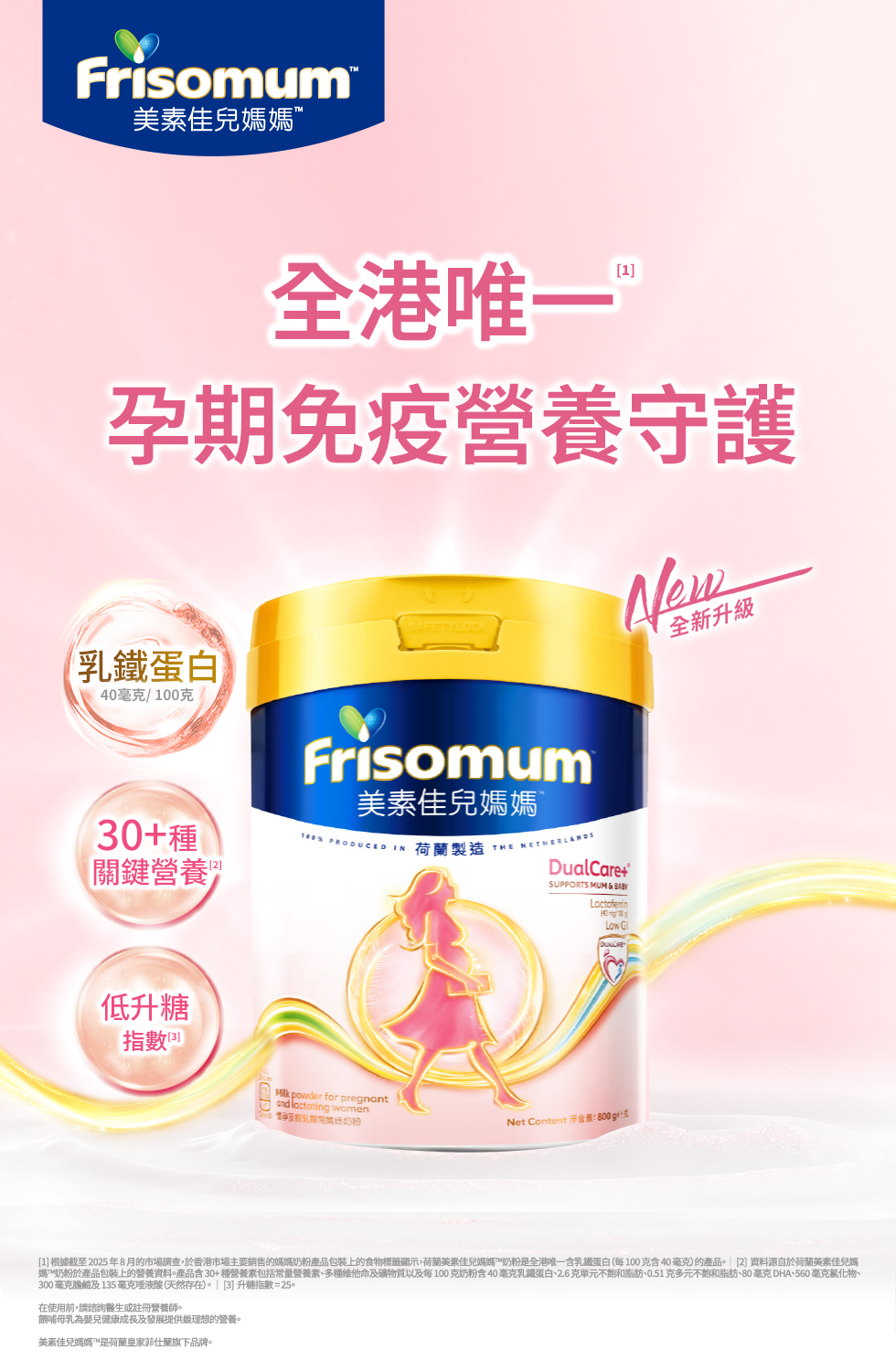 1 根據截至 2025 年 8 月的市場調查,於香港市場主要銷售的媽媽奶粉產品包裝上的食物標籤顯示,荷蘭美素佳兒媽媽TM奶粉是全港唯一含乳鐵蛋白(每 100 克含 40 毫克)的產品。