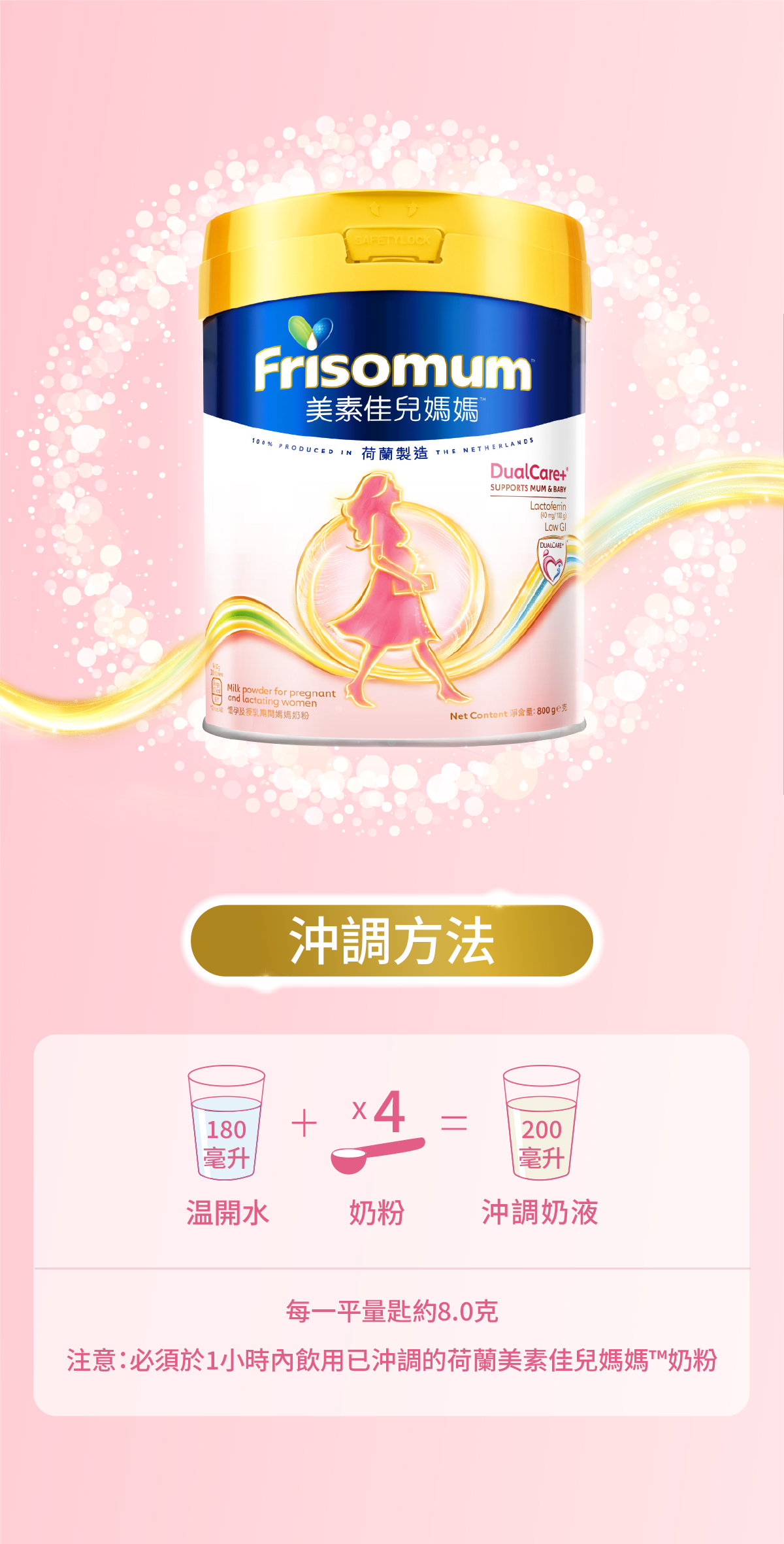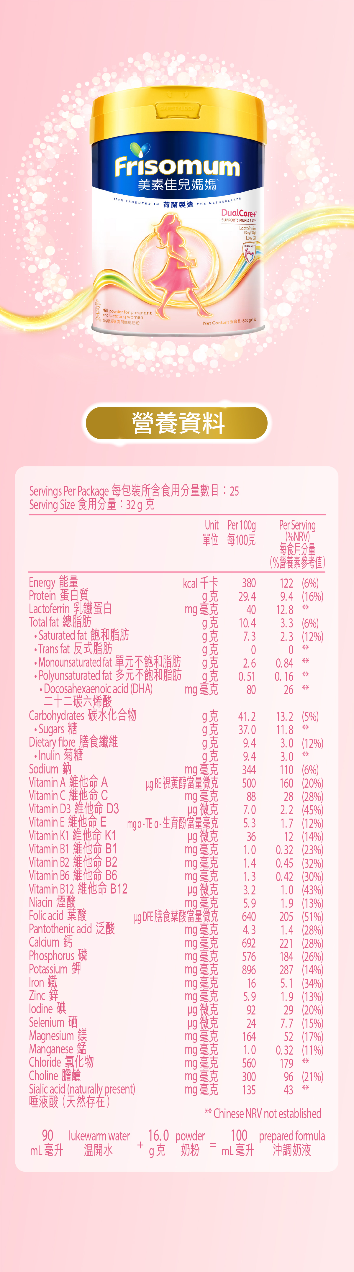 8 資料源自於荷蘭美素佳兒媽媽TM奶粉於產品包裝上的營養資料。產品含30+種營養素包括常量營養素、多種維他命及礦物質以及每100克奶粉含40毫克乳鐵蛋白、2.6克單元不飽和脂肪、0.51克多元不飽和脂肪、80毫克 DHA、560毫克氯化物、300毫克膽鹼及135毫克唾液酸(天然存在)。