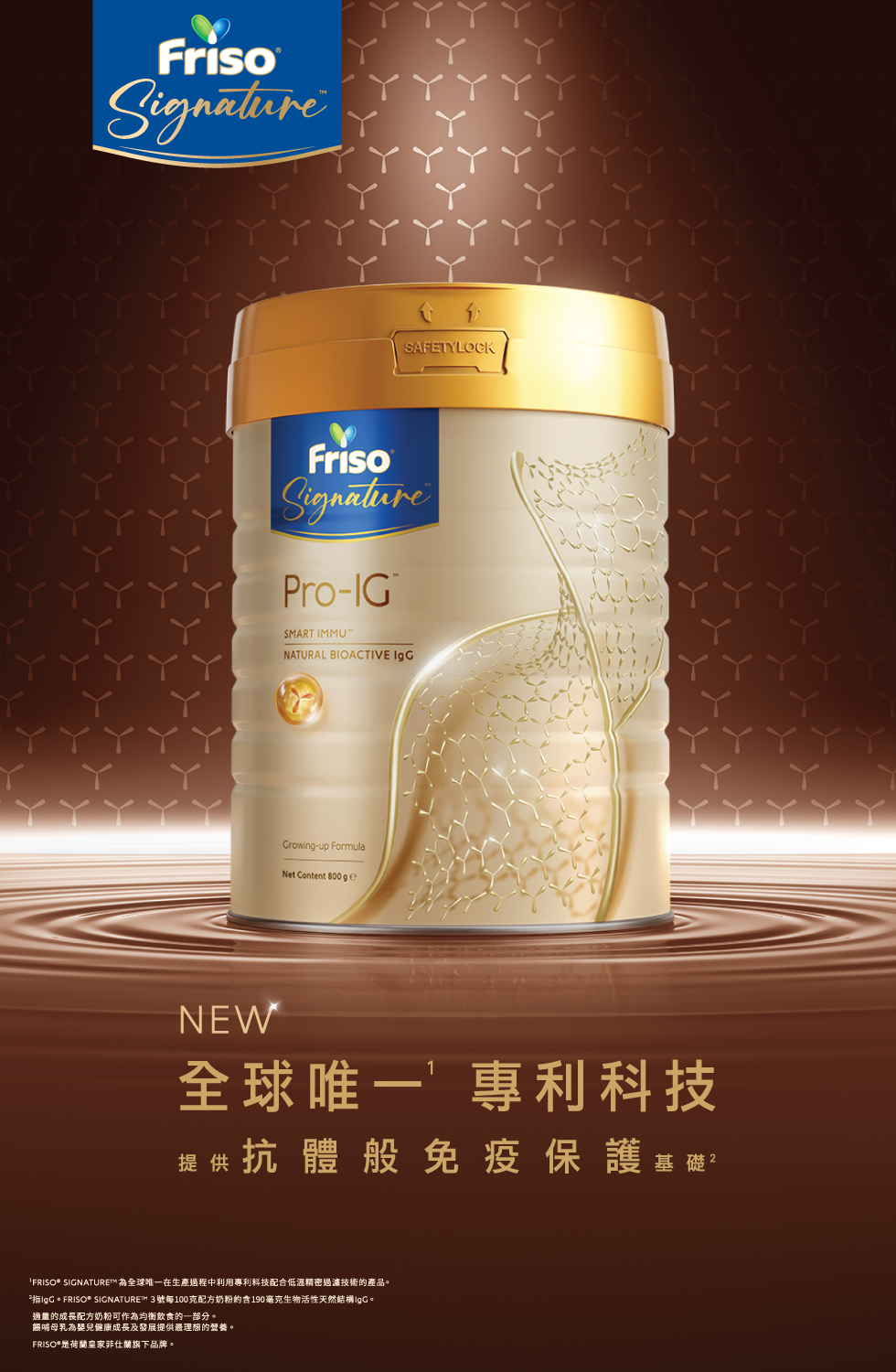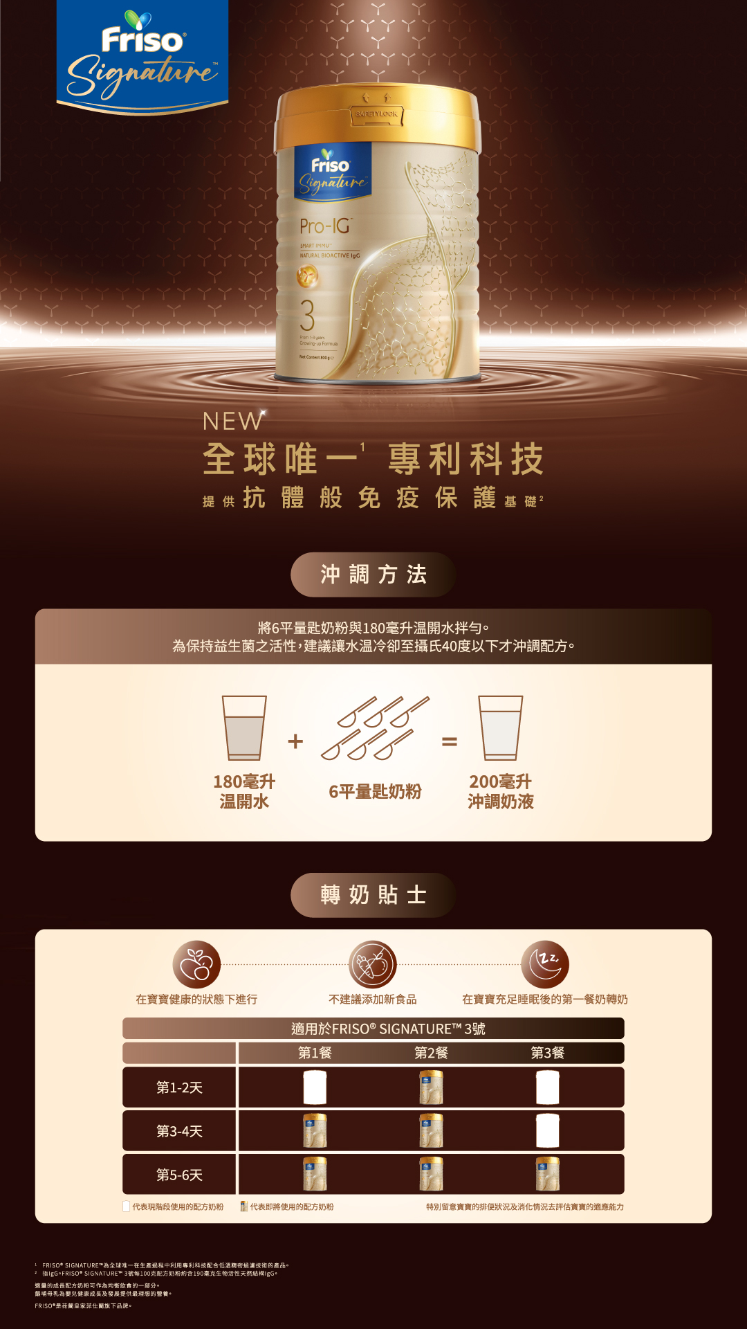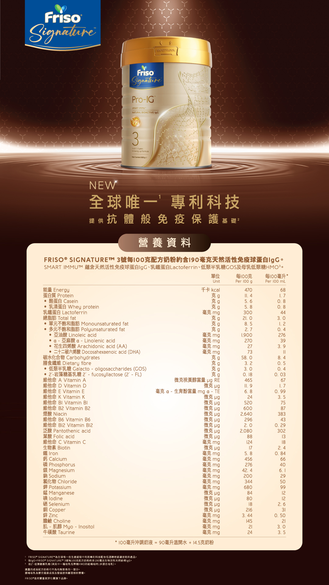³FRISO® SIGNATURE™ 3號每100克配方奶粉約含190毫克生物活性天然結構IgG。